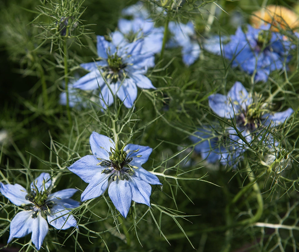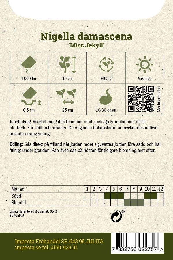 Vackert indigoblå blommor med spetsiga kronblad och dillikt bladverk. För snitt och rabatter. De originella frökapslarna är mycket dekorativa i torkade arrangemang.