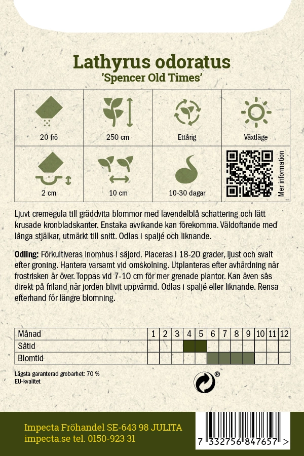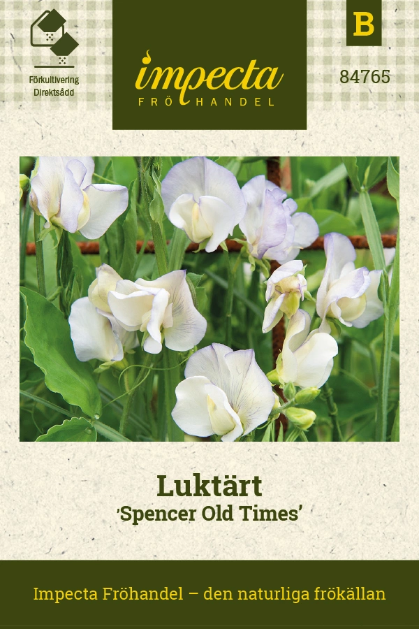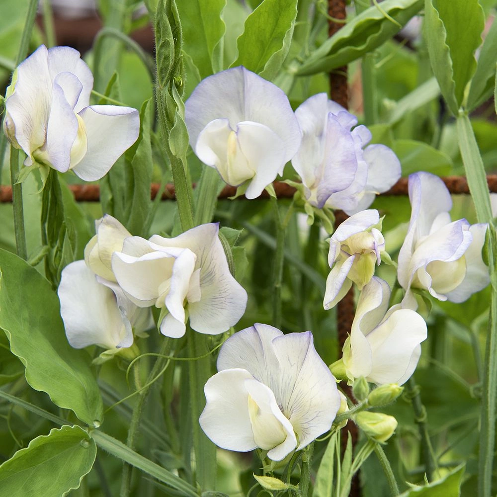 Lathyrus odoratusLjuvt cremegula till gräddvita blommor med lavendelblå schattering och lätt krusade kronbladskanter. Enstaka avvikande kan förekomma. Väldoftan