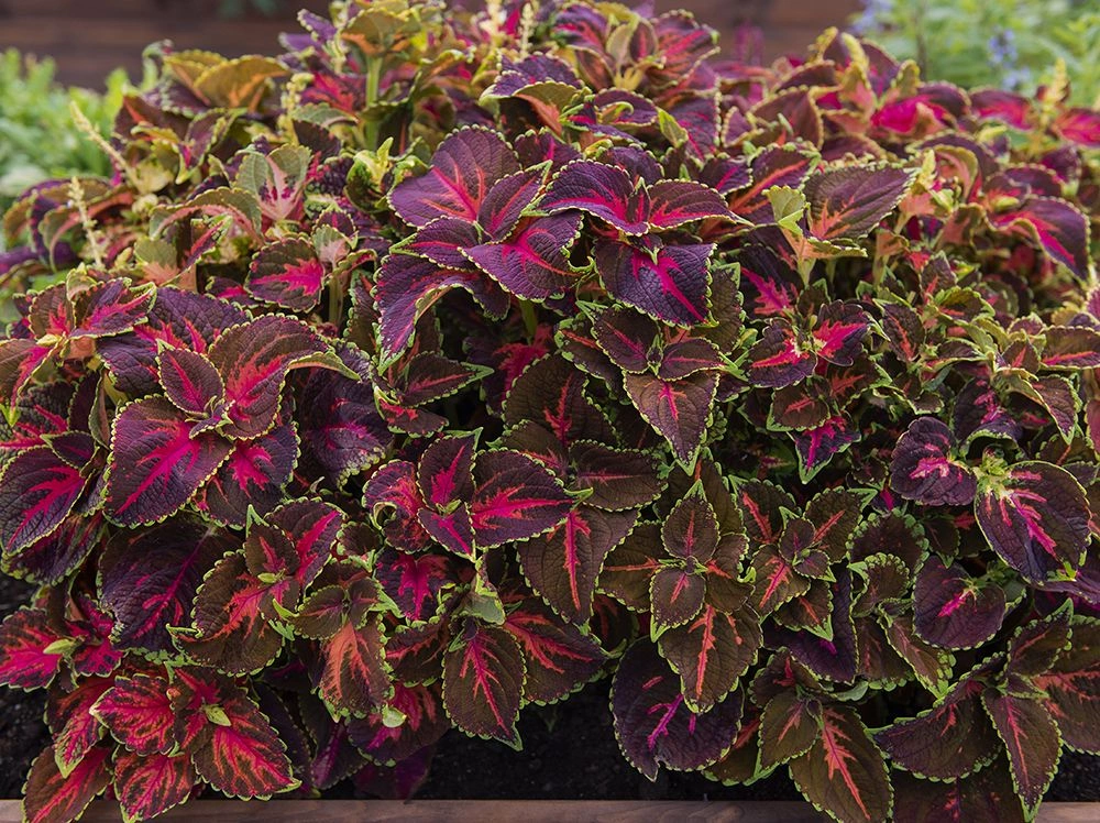Plectranthus scutellarioidesStora, fintandade blad i mörkt rostrött till djupt purpur med ceriserosa till orange teckning och en välmarkerad, ljusgrön kantbård.