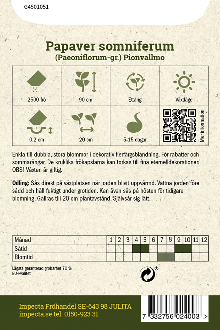 Enkla till dubbla, stora blommor i dekorativ flerfärgsblandning. För rabatter och sommarängar. De kruklika frökapslarna kan torkas till fina eternelldekorationer. OBS! Växten är giftig.