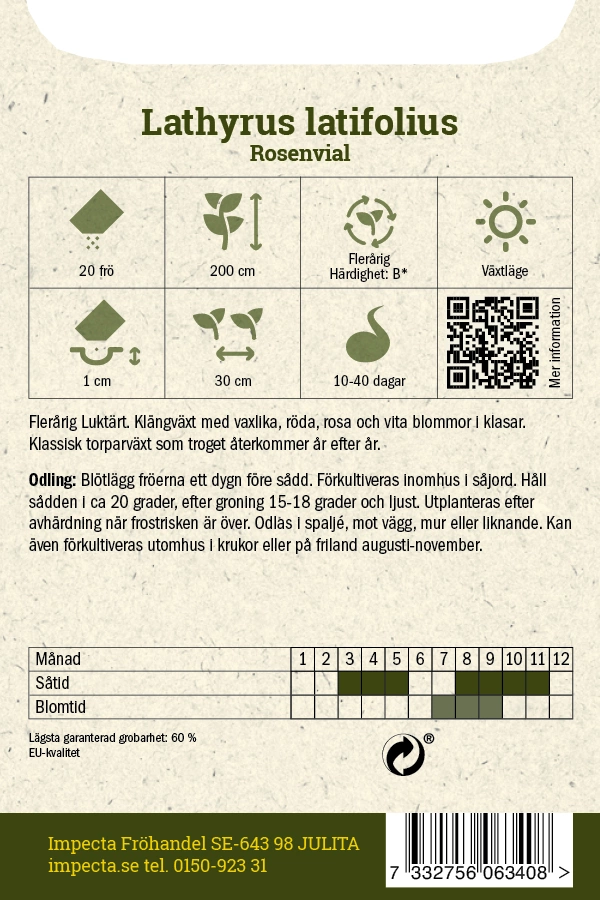 Lathyrus latifoliusKlängväxt med vaxlika, röda, rosa och vita blommor i klasar. Klassisk torparväxt som troget återkommer år efter år.Odling från frö:Blötlägg f