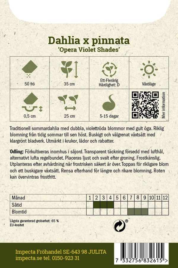 Dahlia x pinnata (Sommardahlia-gr.)Sommardahlia med dubbla, violettröda blommor med gult öga. Riklig blomning från tidig sommar till sen höst. Buskigt och välgr