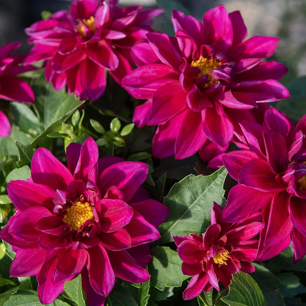 Sommardahlia med dubbla, violettröda blommor med gult öga. Riklig blomning från tidig sommar till sen höst. Buskigt och välgrenat växtsätt med klargrönt bladverk. Utmärkt i krukor, lådor och rabatter.