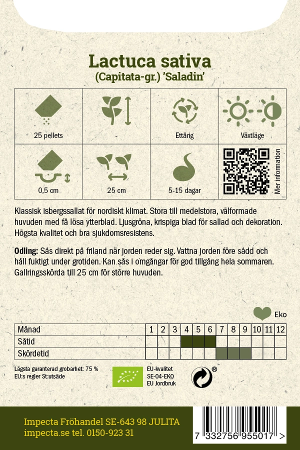 Klassisk isbergssallat för nordiskt klimat. Stora till medelstora, välformade huvuden med få lösa ytterblad. Ljusgröna, krispiga blad för sallad och dekoration. Högsta kvalitet och bra sjukdomsresistens.