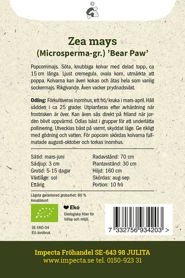 Zea mays (Microsperma-gr.)Popcornmajs. Söta, knubbiga kolvar med delad topp, ca 15 cm långa. Mycket ljust cremegula, ovala korn, utmärkta att poppa till fredags