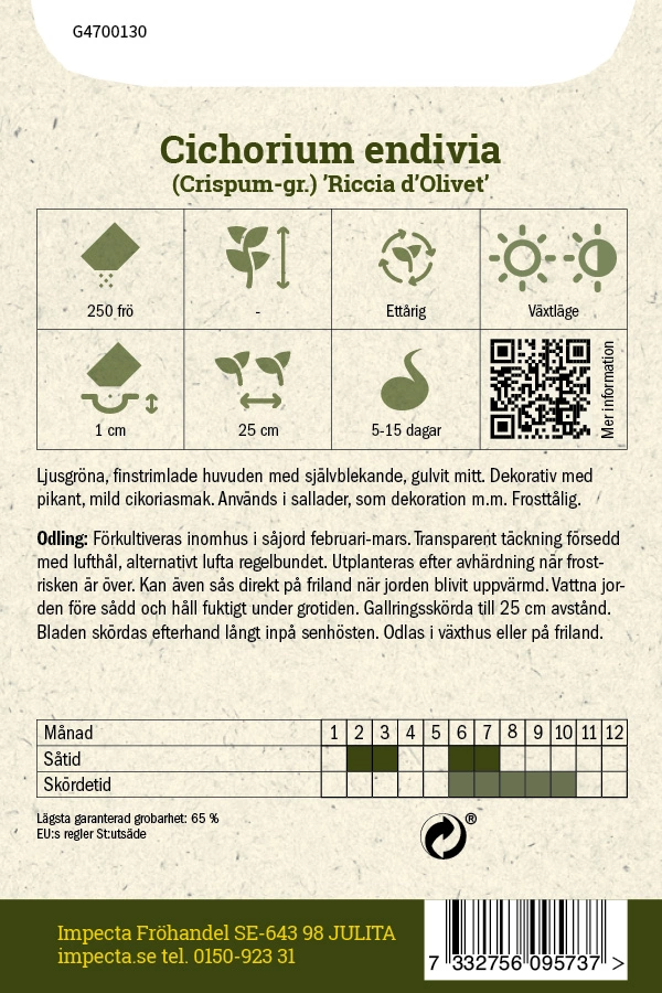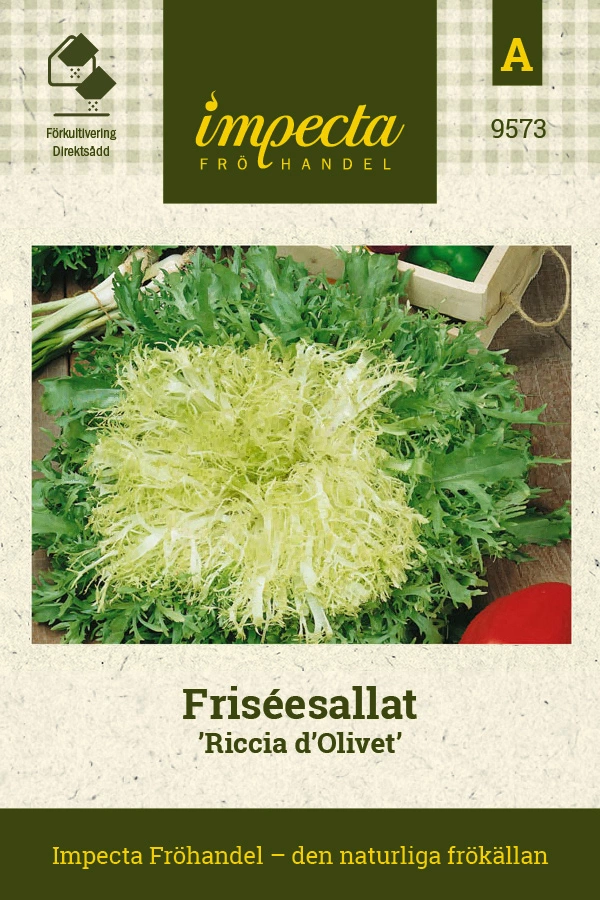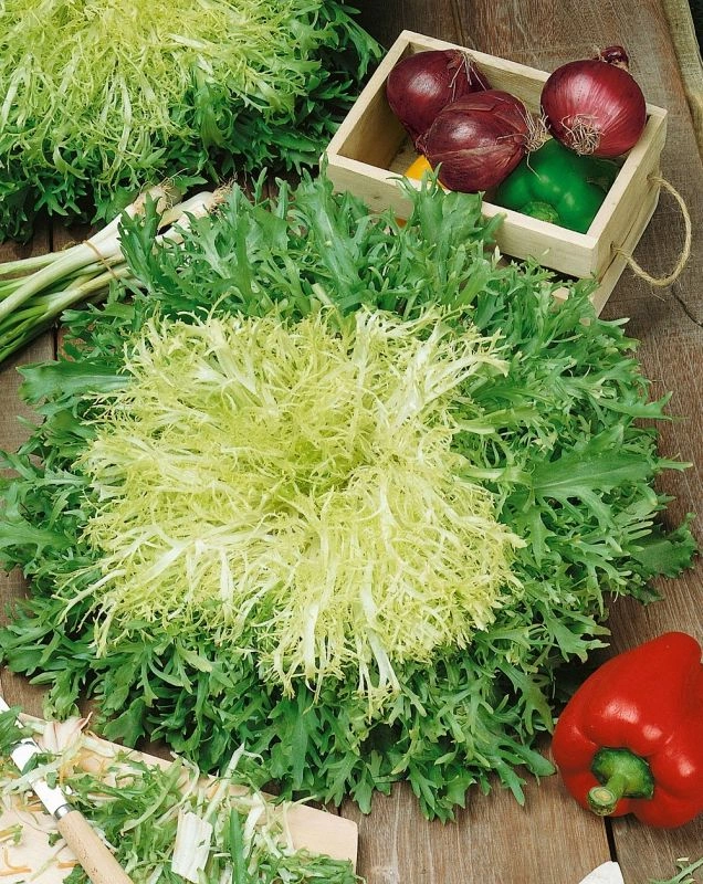 Cichorium endivia (Crispum-gr.)Ljusgröna, finstrimlade huvuden med självblekande, gulvit mitt. Dekorativ med pikant, mild cikoriasmak. Används i sallader, som d