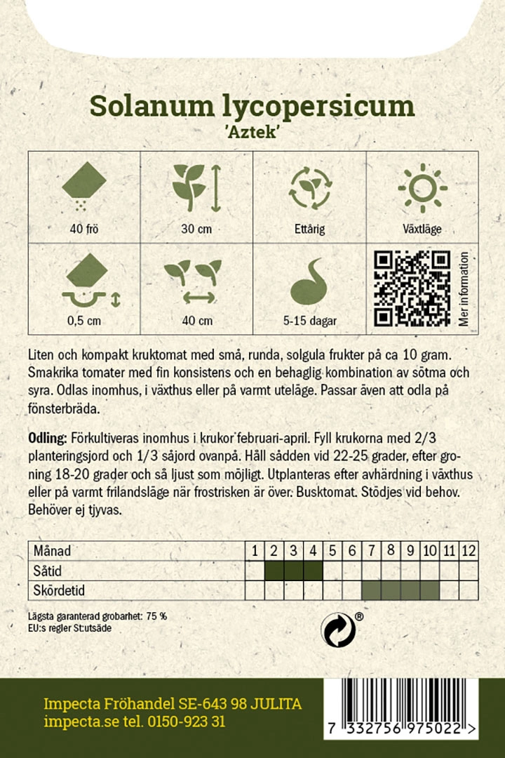 Solanum lycopersicumLiten och kompakt kruktomat med solgula frukter på ca 10 gram. Smakrika tomater med fin konsistens och en behaglig kombination av sötma och