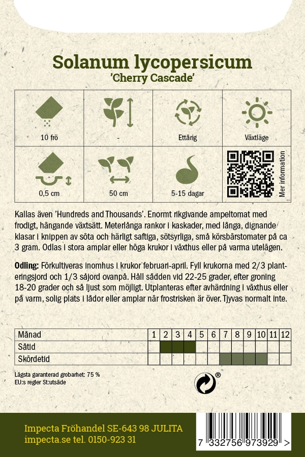 Enormt rikgivande ampeltomat med frodigt, hängande växtsätt. Meterlånga rankor i kaskader, med långa, dignande klasar i knippen av söta och härligt saftiga, sötsyrliga, små körsbärstomater.