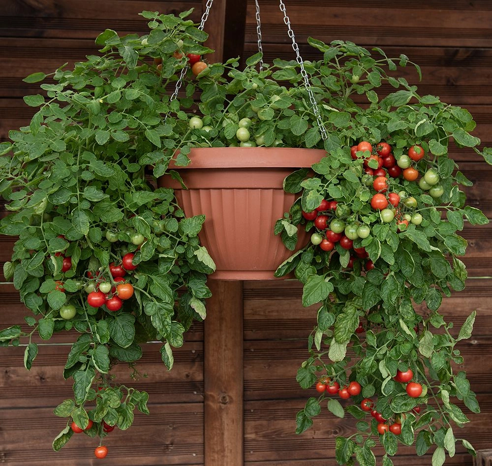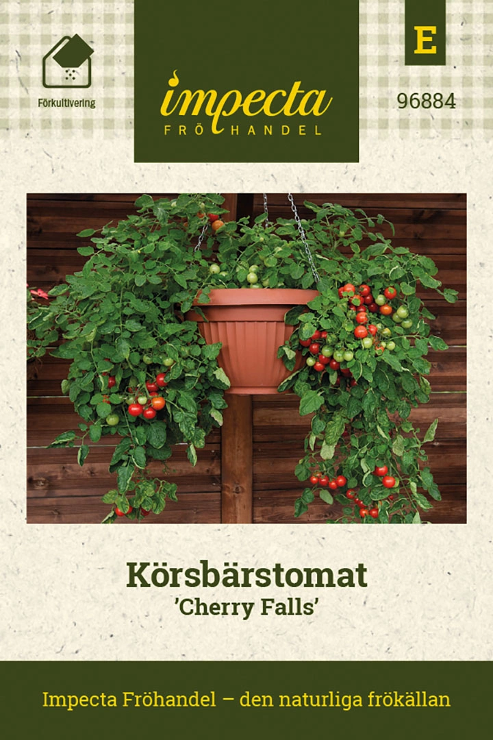Solanum lycopersicumAmpeltomat med mängder av klarröda, små körsbärstomater på ca 10 gram, välsmakande med fin balans mellan sötma och syra. Får ca 60-70 cm lån