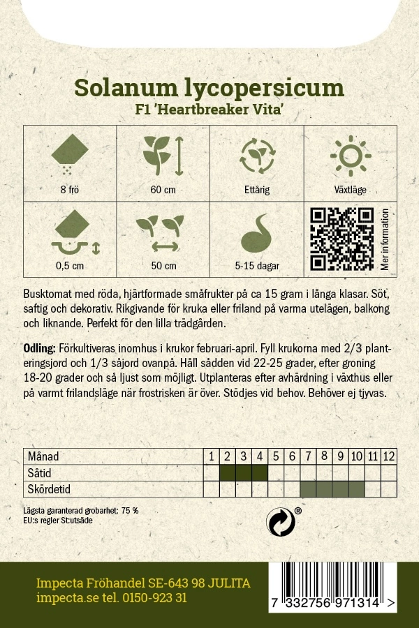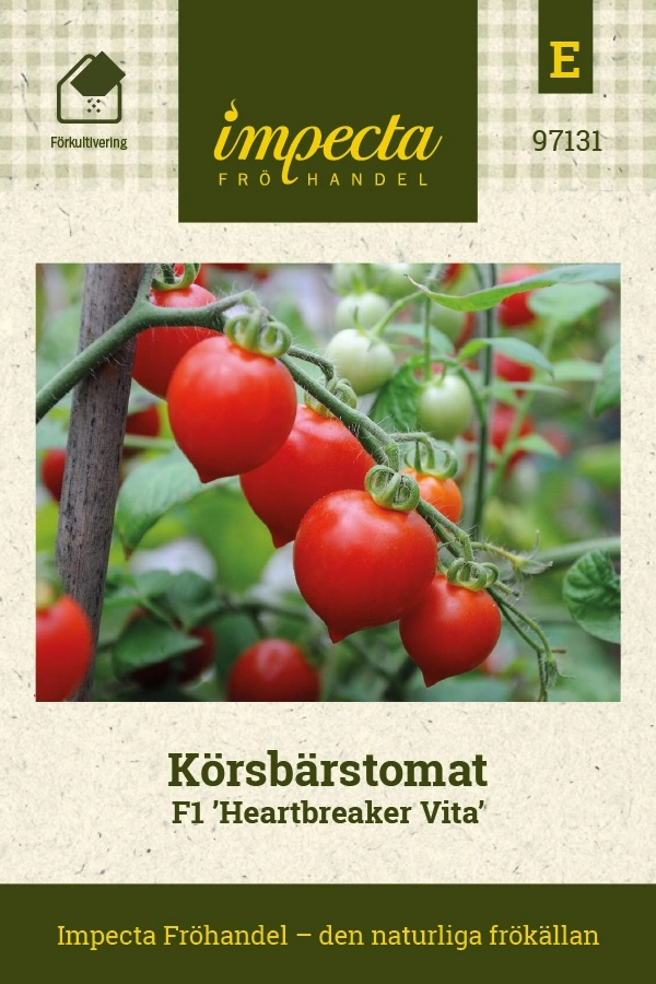 Busktomat med röda, hjärtformade, småfrukter, ca 15 g, i långa klasar. Söt, saftig och dekorativ. Rikgivande för kruka eller friland på varma utelägen, balkong och likn.
