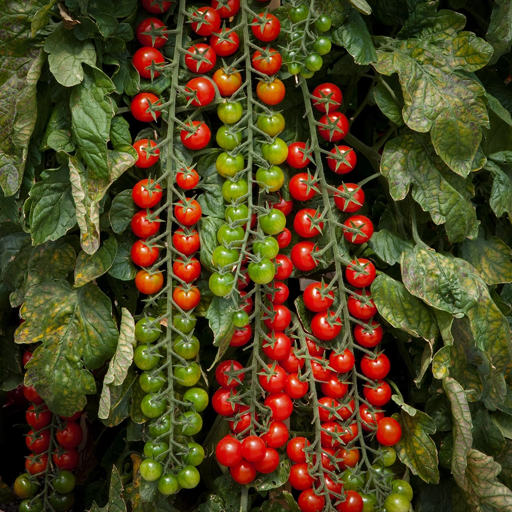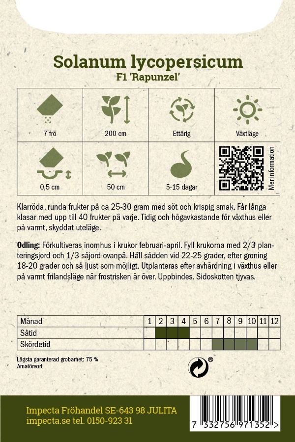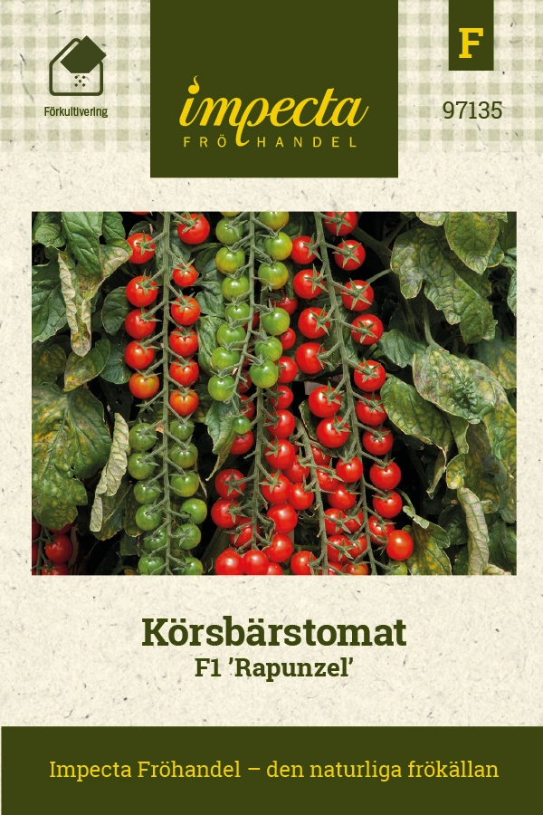 Solanum lycopersicumKlarröda, runda frukter på ca 25-30 gram med söt och krispig smak. Får långa klasar med upp till 40 frukter på varje. Tidig och högavkastand