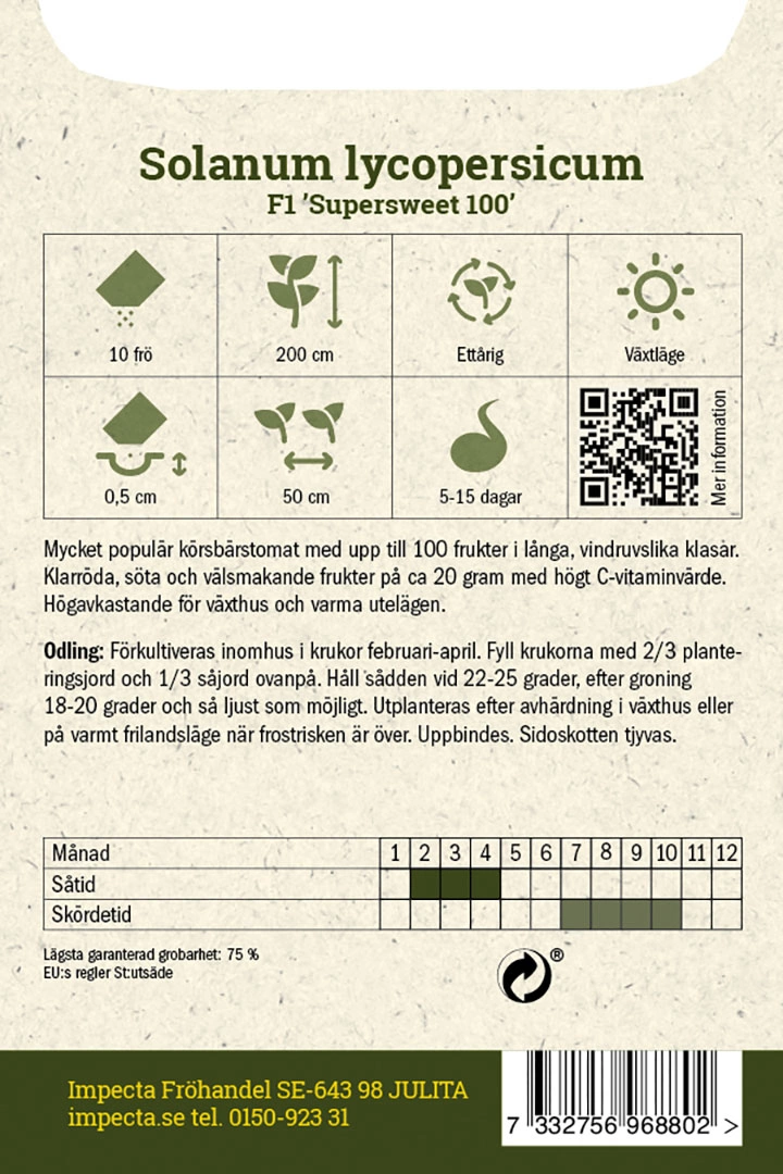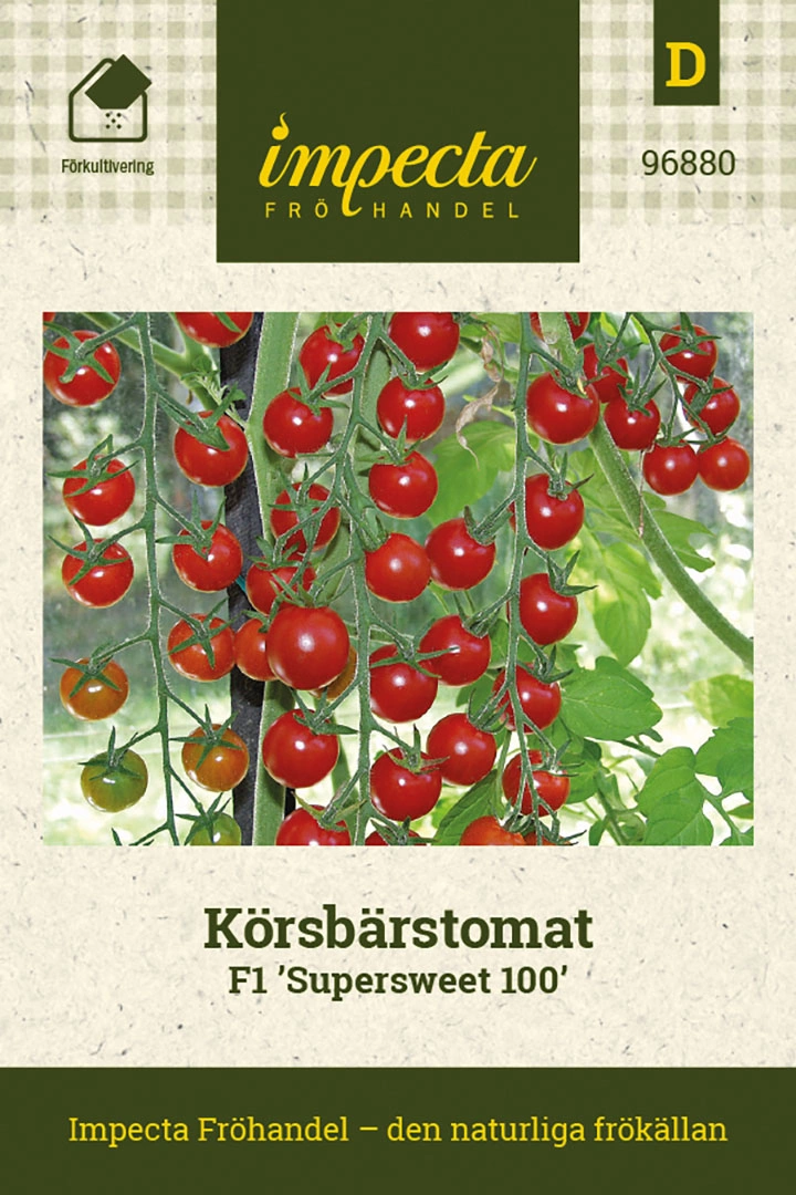 Solanum lycopersicumMycket populär körsbärstomat med upp till 100 frukter i långa, vindruvslika klasar. Klarröda, söta och välsmakande frukter med högt C-vitami