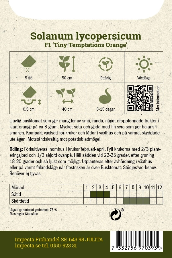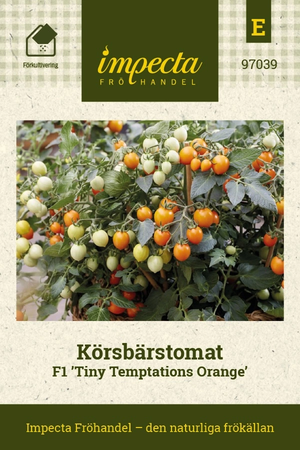 Solanum lycopersicumBusktomat som ger mängder av runda, något droppformade frukter i klart orange på ca 8 gram. Mycket söta med fin syra som ger balans i smaken