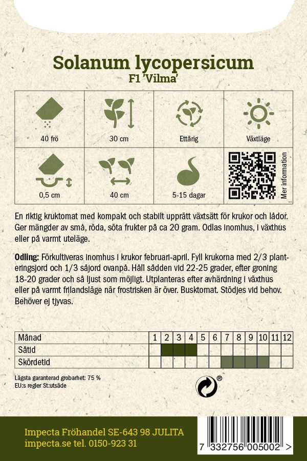 Förkultiveras inomhus. Fyll krukorna med 2/3 planteringsjord och 1/3 såjord ovanpå. Håll sådden vid 22-25 gr, efter groning 18-20 gr, så ljust som möjligt. Utplanteras efter avhärdning i växthus el. varmt frilandsläge när frostrisken är över. Busktomat. Stödjes vid behov. Behöver ej tjyvas.