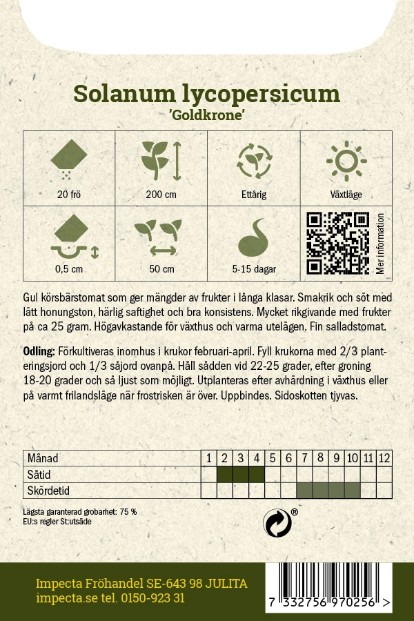 Gul körsbärstomat som ger mängder av frukter i långa klasar. Smakrik och söt med lätt honungston, härlig saftighet och bra konsistens. Mycket rikgivande med frukter på ca 25 g.