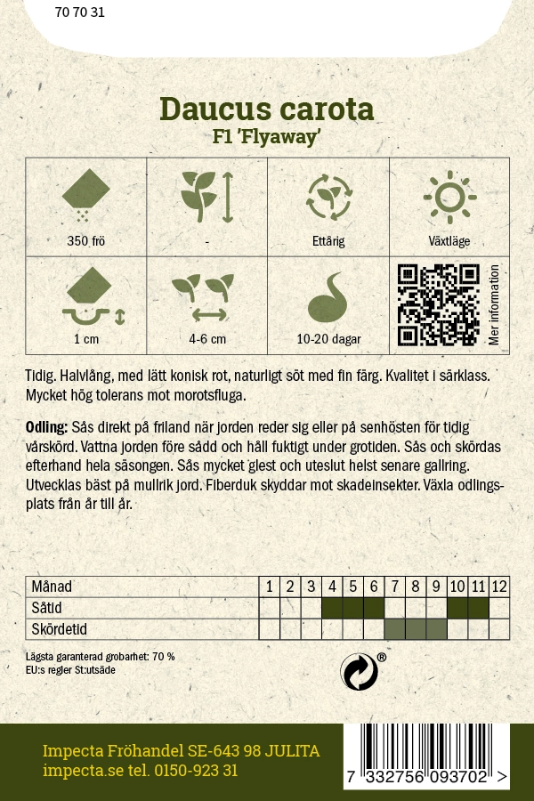 Daucus carotaTidig. Halvlång, med lätt konisk rot, naturligt söt med fin färg. Kvalitet i särklass. Mycket hög tolerans mot morotsfluga.Odling från frö:Sås dire