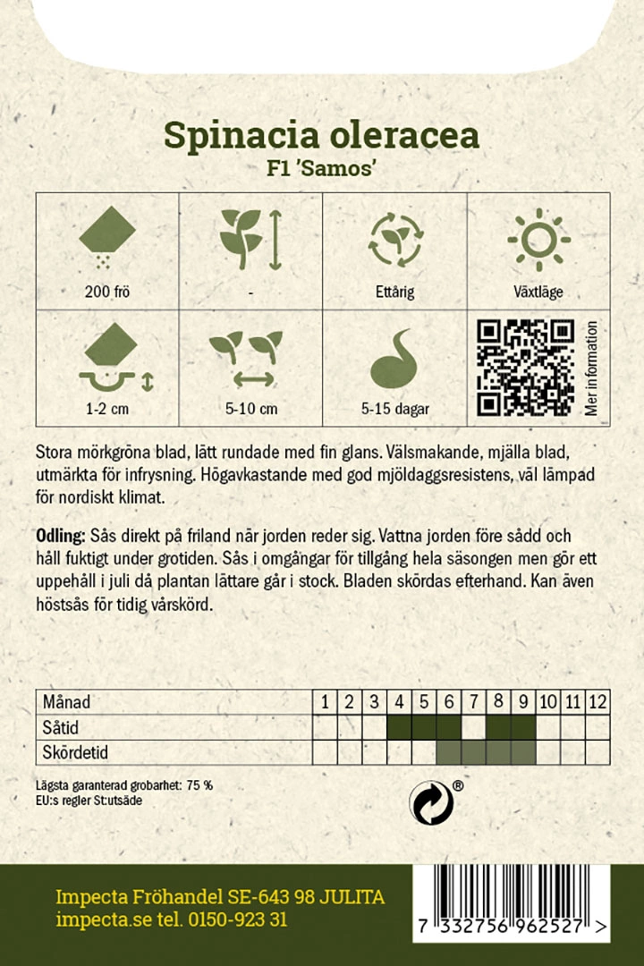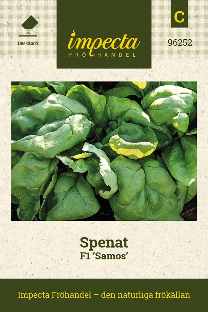 Spinacia oleraceaStora mörkgröna blad, lätt rundade med fin glans. Välsmakande, mjälla blad, utmärkta för infrysning. Högavkastande med god mjöldaggsresistens,