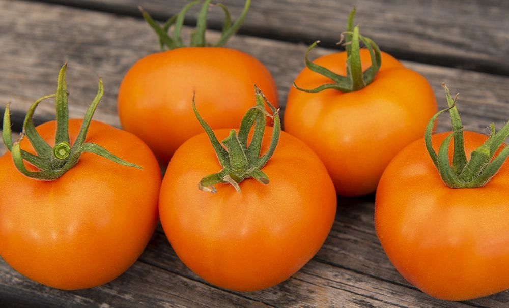 Solanum lycopersicumDjupt orange, något plattrunda, saftiga tomater på ca 100 gram, med mörkrött kärnhus. Fin balans av sötma och syra. Ovanlig, dekorativ tomat