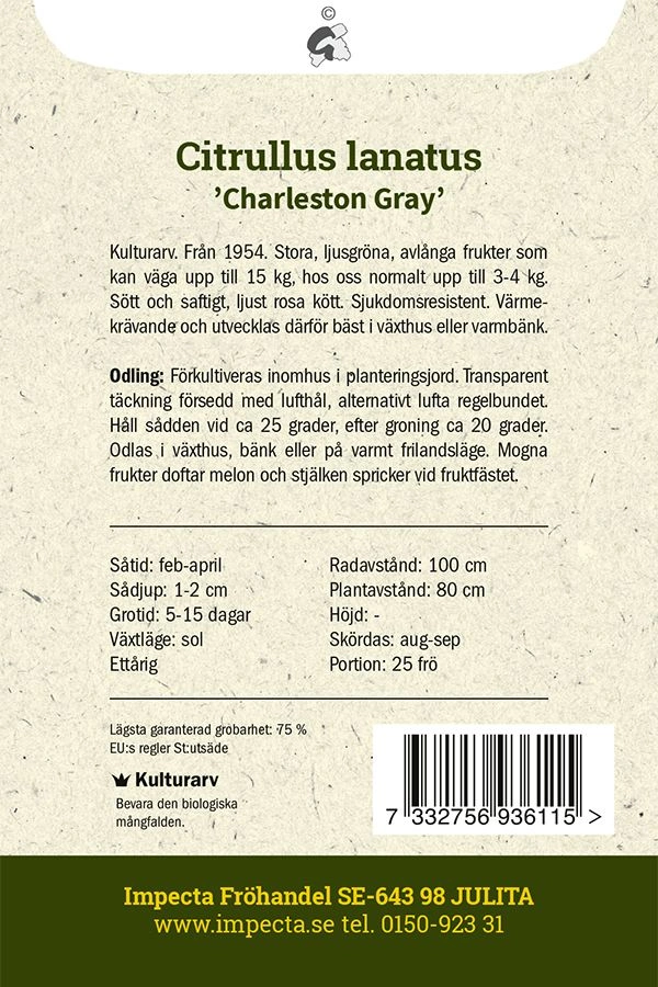 Citrullus lanatusFrån 1954. Stora, ljusgröna, avlånga frukter som kan väga upp till 15 kg, hos oss normalt upp till 3-4 kg. Sött och saftigt, ljust rosa kött. S