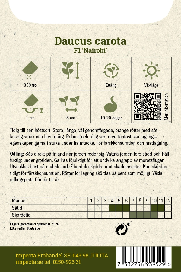 Daucus carotaTidig till sen höstsort. Stora, långa, väl genomfärgade, orange rötter med söt, krispig smak och liten märg. Robust och tålig sort med fantastiska