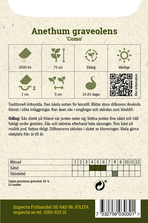 Sås direkt på friland när jorden reder sig. Vattna jorden före sådd och håll fuktigt under grotiden. Sås och skördas efterhand hela säsongen. Trivs bäst på mullrik jord. Vattna rikligt. Dillkronorna skördas i slutet av blomningen. Växla gärna växtplats från år till år.