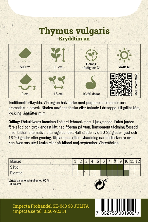 Thymus vulgarisTraditionell örtkrydda. Vintergrön halvbuske med purpurrosa blommor och aromatiskt bladverk. Bladen används färska eller torkade i ärtsoppa, till