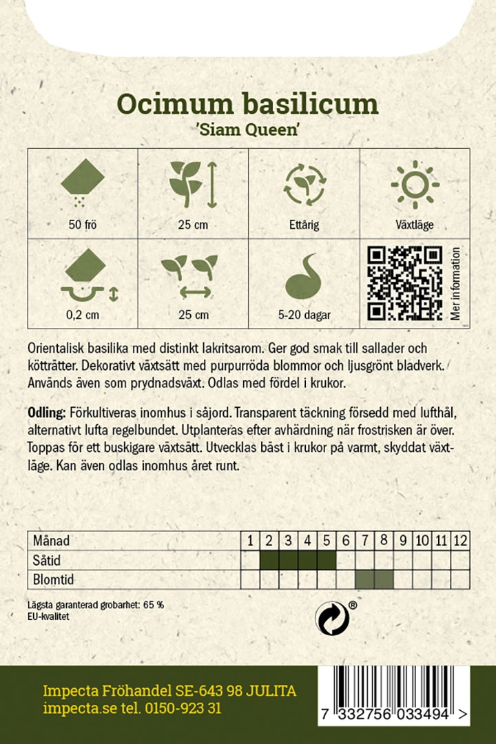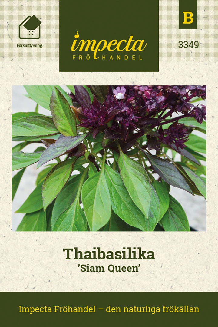 Ocimum basilicumOrientalisk basilika med distinkt lakritsarom. Ger god smak till sallader och kötträtter. Dekorativt växtsätt med purpurröda blommor och ljusgrö